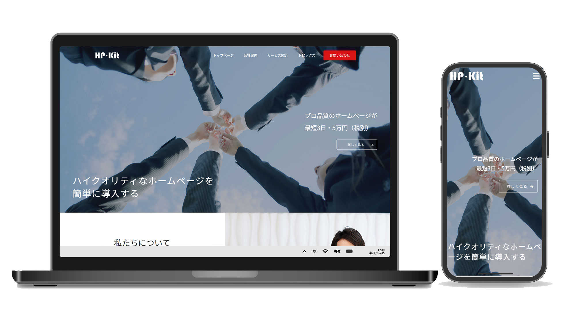 写真やテキスト、会社のロゴデータ、コーポレートカラーをご提供いただければ、キットをベースにして色の調整をしてホームページを制作します。